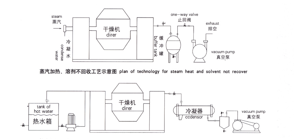 SZG雙錐回轉真空干燥機為雙錐形的回轉罐體,罐內在真空狀態下,向夾套內通入蒸汽和熱水進行加熱,熱量通過罐體內壁與濕物料接觸。濕物料吸熱后蒸發的水汽,通過真空泵經真空排氣管被抽走。由于罐體內處于真空狀態,且罐體的回轉使物料不斷的上下,內外翻動,故加快了物料的干燥速度,提高干燥效率,達到均勻干燥的目的。