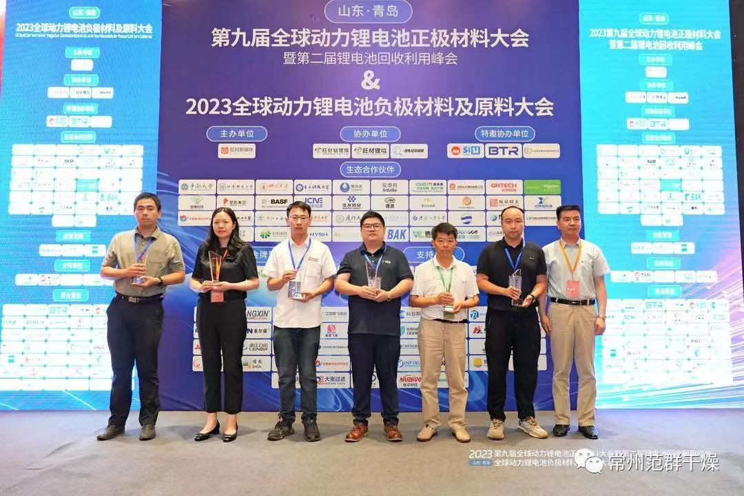 2023 年7月 6-7日,旺材鋰電在青島舉辦了“2023第九屆全球動力鋰電池正極材料大會暨第二屆鋰電池回收利用峰會”,常州范群獲得旺材鋰電“金翎獎”優質供應商企業。