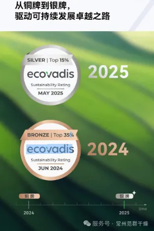 20258月,常州市范群干燥設備有限公司實現了EcoVadis評級躍升,成功摘得銀牌認證,躋身全球評級企業前15%,這是對常州范群在環境保護、勞工與人權、商業道德、可持續采購等方面的持續努力的充分肯定,創造企業歷史最佳成績。