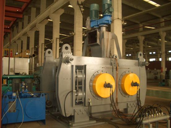 該對輥式壓片造粒機由機架組件,壓輥組件,傳動裝置,液壓緩沖組件及喂料機五部分組成.其工作原理為: 該機利用成對壓輥,彼此留有一定間隙,采用同步控制器控制兩臺電機和減速機,使對輥同步且相向運轉。其中一組對輥軸座固定,另一組對輥軸座滑動,藉助液壓缸施壓彼此緊靠,同時液壓系統還起補償作用。壓輥表面有規則地排列許多形狀、大小相同的穴孔(弧槽),根據物料對象壓縮比的不同,選擇采用一壓輥穴孔的波谷正好對準另一壓輥的波谷或波峰對準波谷。兩壓輥呈水平布置,粉粒狀物料從兩壓輥上方連續、均勻地靠自重及擠壓絞龍強制喂入兩壓輥之間,當物料進入咬入區后逐漸被壓輥咬入,隨著壓輥的連續旋轉,物料占有的空間逐漸減少而被逐步壓縮,并達到成型壓力的最大值,隨后,則壓力逐漸降低,所壓得之壓片,因彈性回復加其壓片自重而脫落壓輥弧槽,接下來進入切碎、整粒裝置并篩分至粒狀產品。