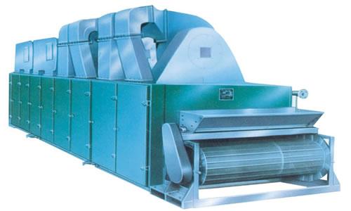 物料由加料器均勻地鋪在網帶上,網帶一般采用12-60目不銹鋼絲網,由傳動裝置拖動在干燥機內移動。干燥機由若干單元組成,每一單元熱風獨立循環,部分尾氣由專門排濕風機排出,廢氣由調節閥控制,熱氣由下往上或由上往下穿過鋪滿物料的網帶完成熱量與質量傳遞的進程,帶走物料水份。網帶緩慢移動,運行速度可根據物料溫度自由調節,干燥后的成品連續落入收料器中。上下循環單元根據用戶需要可靈活配備,單元數量亦可根據需要選取。